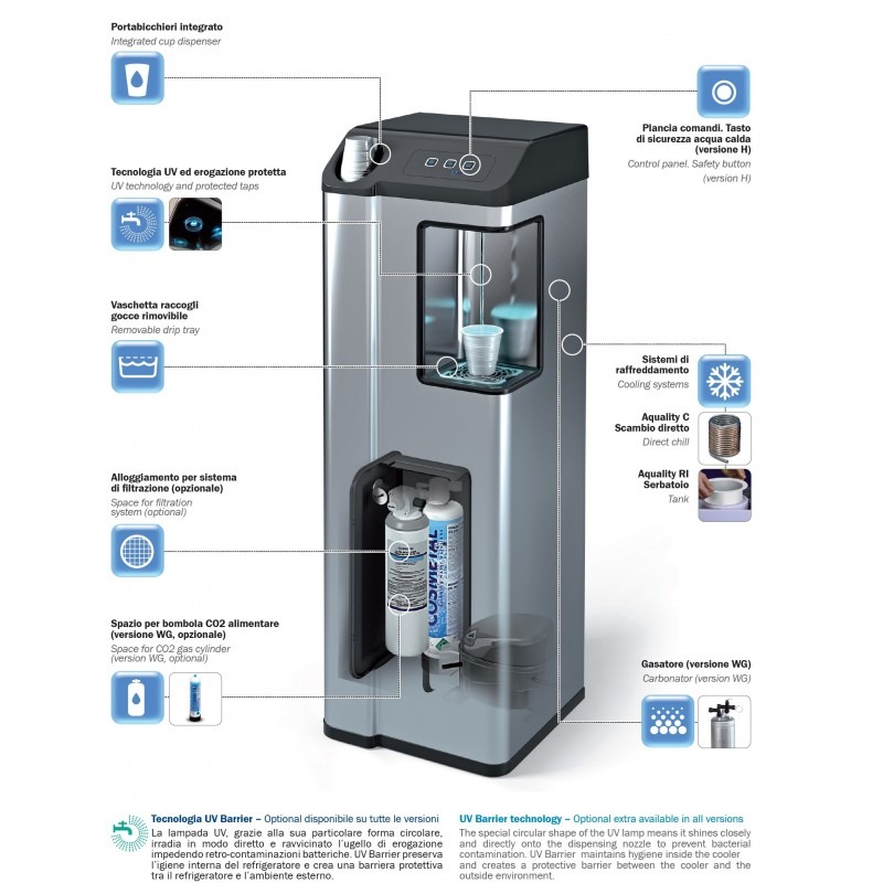Prodotto Made in Italy di alta qualità, molto affidabile, dal design funzionale ed ergonomico, a 2 o 3 pulsanti selettori, con produzione di acqua fredda/temperatura ambiente/calda/naturale/gassata (a seconda del modello, come quotato in tabella). Termostato regolabile e vano portabicchieri incorporato (si consiglia l’utilizzo di borracce o bicchieri compostabili, in cartoncino o in plastica compostabile PLA).